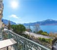 • terraced balcony with tiled floor, sliding glass door, large glass railing, panoramic view of lake and mountains