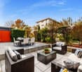 • Modern apartment building, concrete structure, multiple floors, balconies, terraces, exterior hanging swing, potted plants, outdoor dining area
