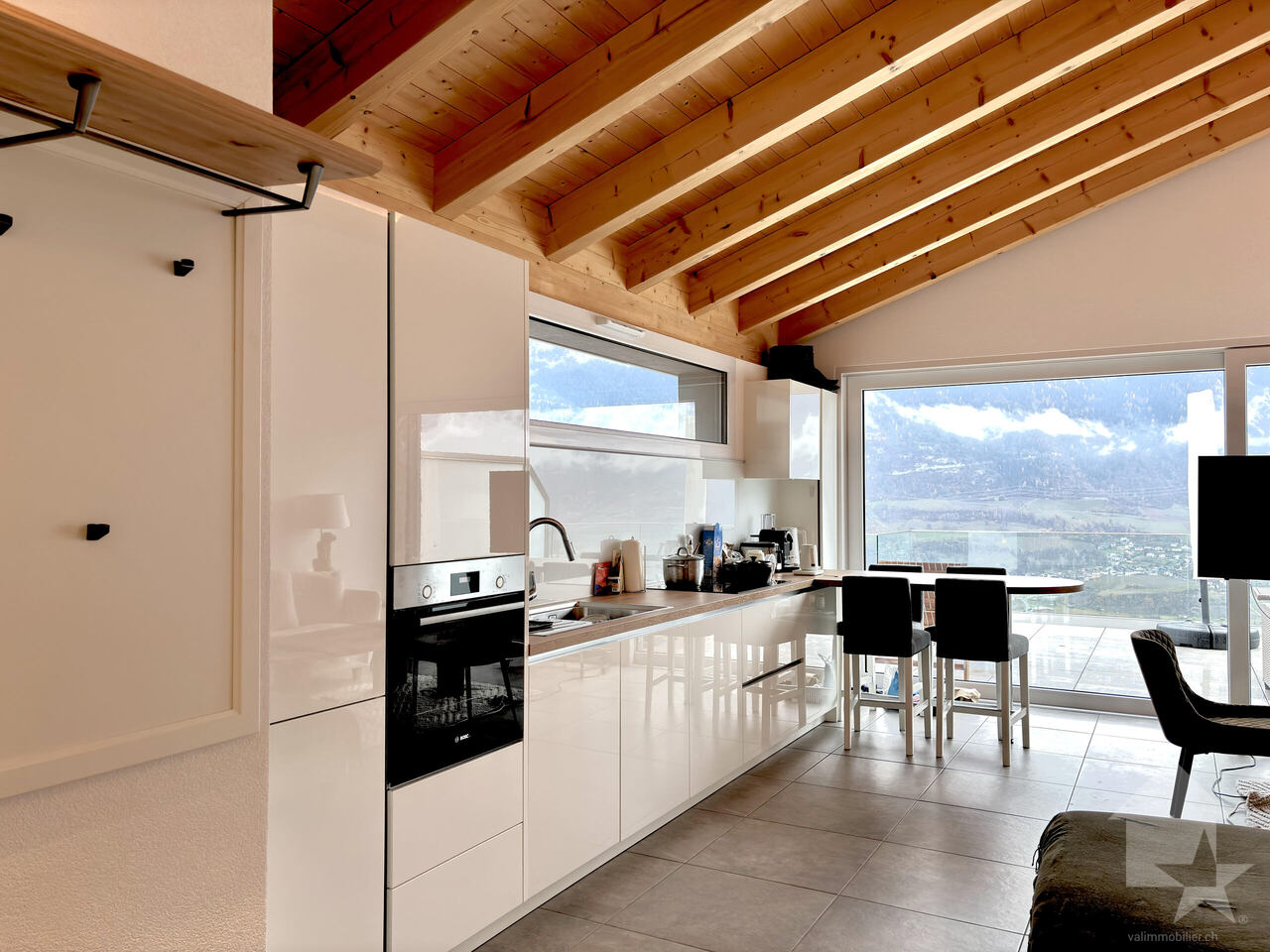 Exclusivité Valimmobilier !Ce sublime appartement en attique de 106 m2 de surface pondérée se situe dans un petit bâtiment de 6 propriétaires. Sa grande terrasse orientée sud-est avec une vue panoramique sur la vallée ainsi que les sommets, sa pièce de vie avec sa belle charpente et son agencement sauront vous séduire ! Il bénéficie d'une luminosité optimale. Il est doté d'un espace galetas et d'une cave. Il y a la possibilité d'acquérir une place de parc. Situé dans le quartier calme de Corin à moins de 20 minutes de Crans-Montana et à moins de 10 minutes de la ville de Sierre, vous pourrez profiter pleinement d'un appartement composé de matériaux de qualité et d'une vue époustouflante.Sa distribution est la suivante : • Entrée • Cuisine équipée ouverte sur le séjour • 1 WC visiteurs • 1 chambre avec accès direct à la terrasse • 1 grande chambre • 1 salle de bains avec WC et raccordement pour la colonne de lavage Place de parc : • 1 place de parc extérieur couverte inclue dans le prix Caractéristiques : • Efficacité énergétique A grâce à ses panneaux solaires et sa pompe à chaleur • Panneaux solaires • Raccordement pour colonne de lavage dans l'appartement • Prise USB et USB-C directement dans l'appartement • Lumière LED avec variateur de lumière • Stores électriques Complément d'informations : • Terrasse de 47 m2 orientée sud-est • Plan étudié pour la pose d'un jacuzzi sur la terrasse • 1 galetas avec l'accès depuis l'appartement • 1 cave • Interphone principal à l'entrée du bâtiment avec possibilité d'ouvrir la porte et de dialoguer • Ascenseur dans le bâtiment L'appartement possède une surface intérieure brute de 81 m2 et une surface habitable pondérée avec 1/1 terrasse de 106 m2.Pour tous les détails ainsi que l'intégralité des photos, visitez notre site : www.valimmobilier.chVous souhaitez obtenir des précisions, le dossier complet ? Contactez moi par téléphone ou par e-mail et je vous renseignerai très volontiers. Je me tiens également à votre disposition pour une visite sur place.Corin, situé au pied du coteau viticole fait partie de la Commune de Crans-Montana. Ses deux pittoresques chapelles et ses nombreuses caves sont bien connues dans la région. Toutefois, c'est l'écrivaine Corinna Bille qui a donné à ce hameau une résonance internationale.