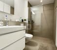 • Spacious bathroom with beige tile walls, a vanity with a sink, a large mirror cabinet, a shower area, and a potted plant. The bathroom also features a towel rack and a small side table.
