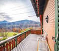 white house with metal railing balcony, green lawn, trees, and mountains in the distance