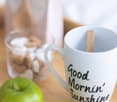 • Large mural on wall depicting clock hands and buildings, tiled floor, ceiling light, potted plant on the left side, grey walls.