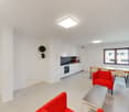 • Living room: two grey armchairs, white cabinets, coffee table, large windows