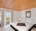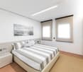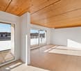 • Spacious room with large sliding glass doors, white walls, and tile flooring. The room has a minimalist and modern design aesthetic.