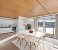 • Spacious living room with large sliding glass doors providing a scenic view of the surrounding countryside. The room features a minimalist design with white walls and gray tile flooring. The sliding doors allow for abundant natural light and access to the