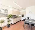 • The image shows a modern, open-plan apartment with a kitchen and living area. The apartment has white walls, gray tile flooring, and a minimalist white kitchen with built-in appliances. The space appears to be newly renovated and has a clean, minimalist a