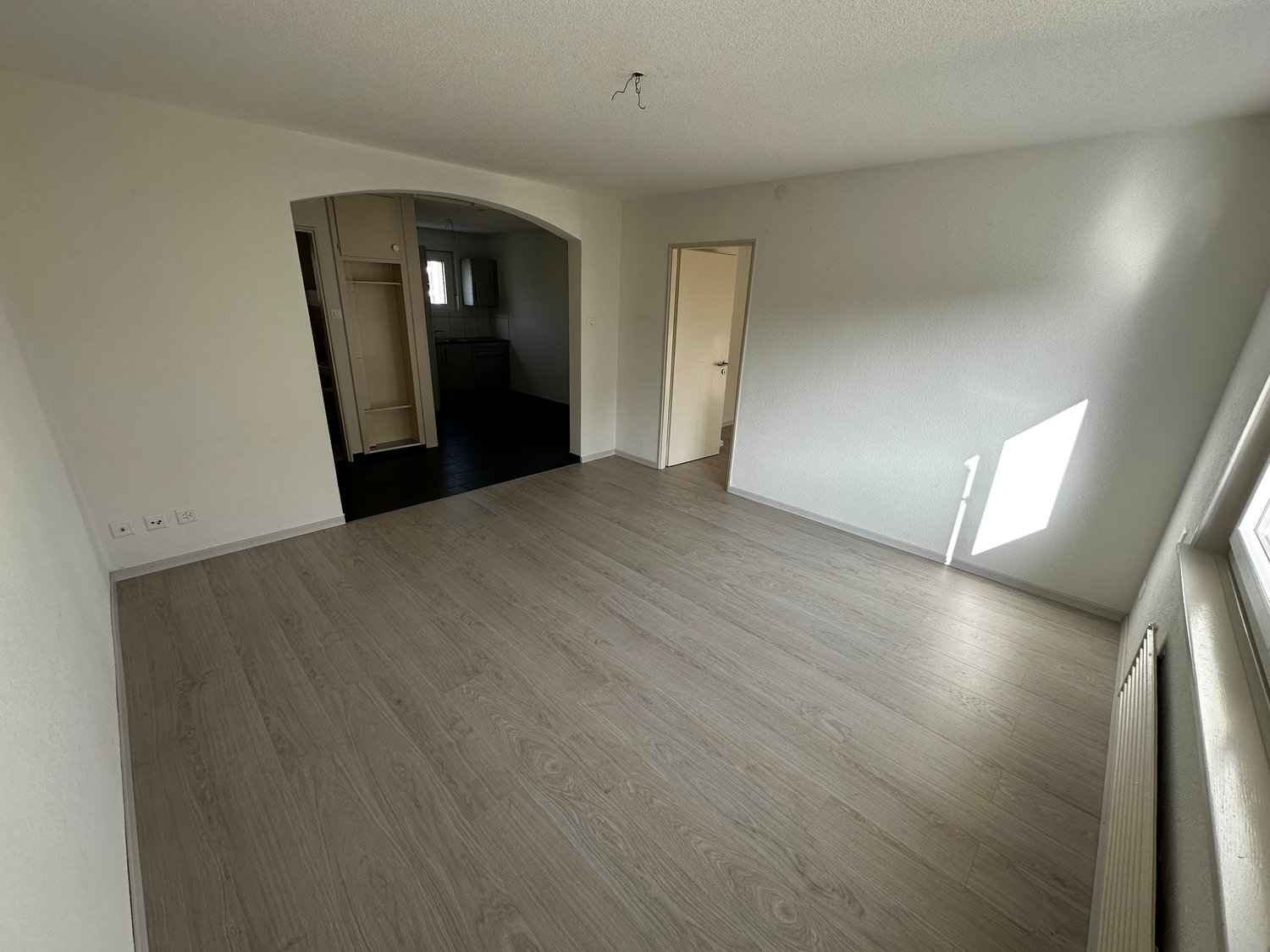 • empty room, wooden floor, white walls, window, radiator, power outlet