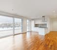 • empty room, hardwood floor, white walls, sliding glass door, windows