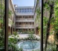 • modern building, 3 floors, balconies on each floor, large windows, concrete foundation, parking area in front