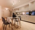 • Open plan kitchen, granite countertops, stainless steel sink, modern cabinets, stainless steel appliances, white walls, double-glazed window, wood flooring, under-counter cabinets