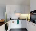 • Modern, L-shaped kitchen with white cabinets, black countertops, and a built-in dishwasher. The kitchen has a tiled floor in a dark color scheme.