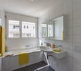 • Bathroom with bathtub, sink, and washing machine