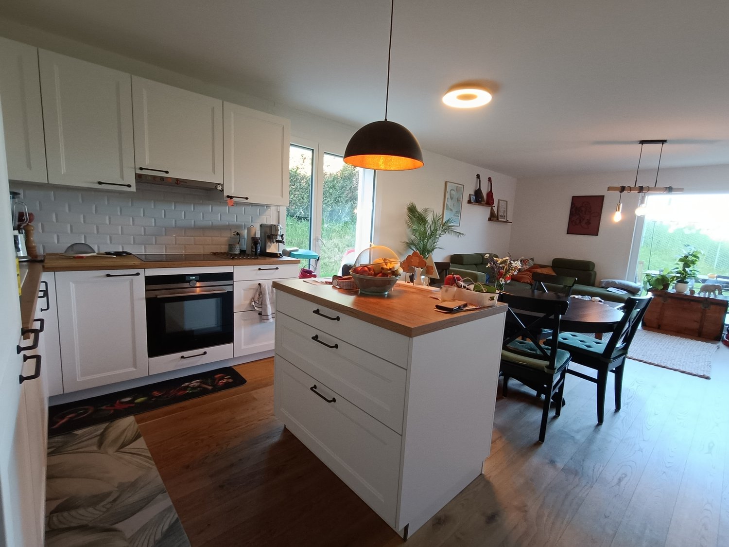 • Open living and dining area, wooden floor, large glass doors, dining table and chairs, wooden cabinet, sofa, plant