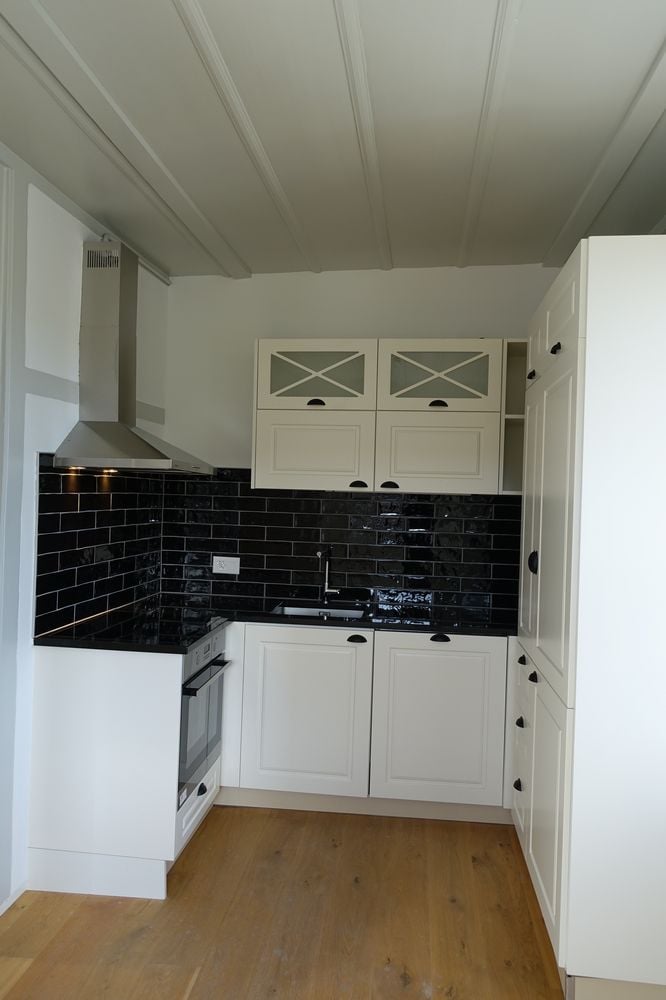 • modern white kitchen with wooden flooring, gas stove, oven, dishwasher, washing machine, and white cabinetry