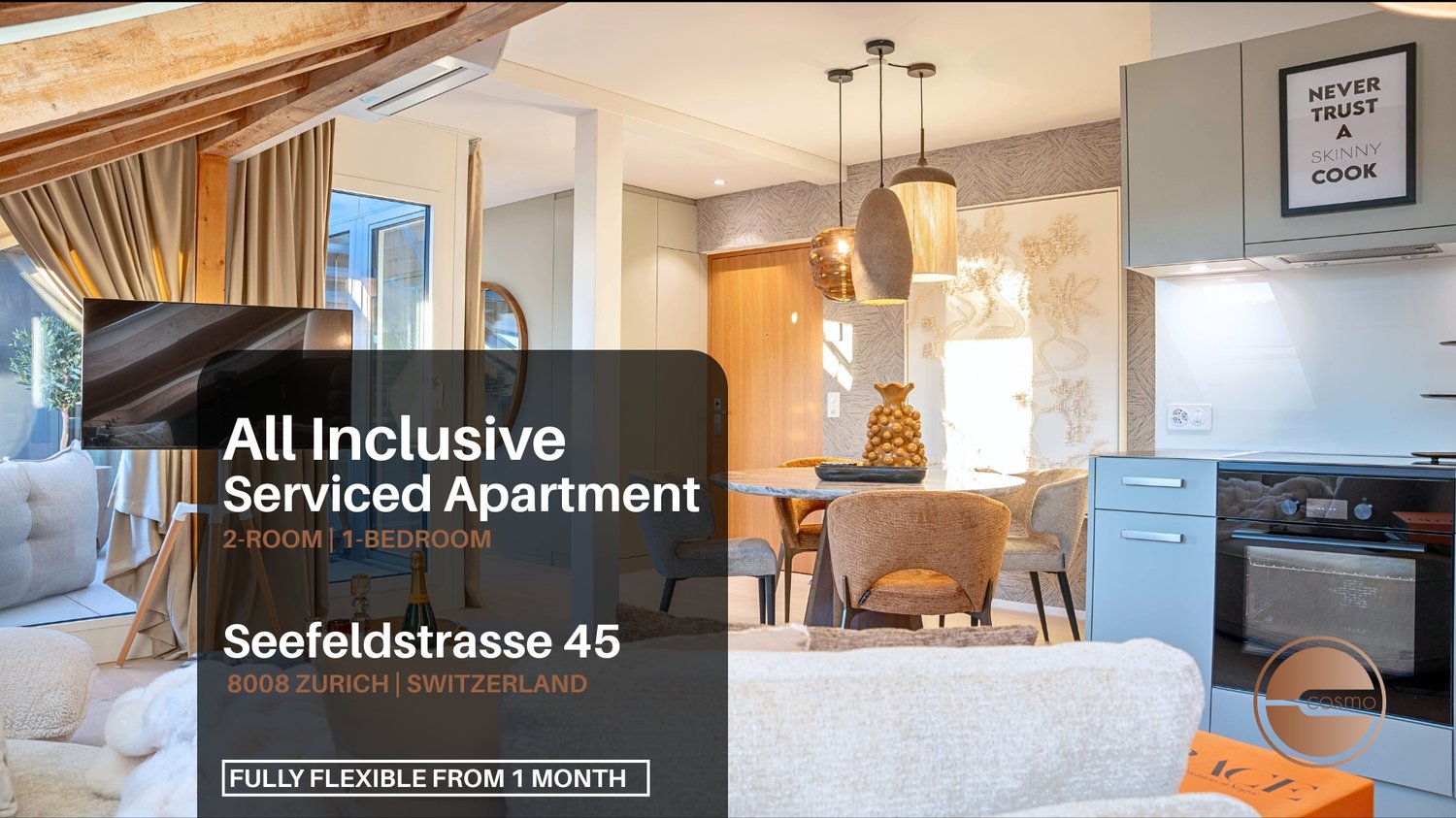 MODERNER LUXUS IM HERZEN VON ZÜRICH SEEFELDTauchen Sie ein in das unvergleichliche Wohnerlebnis, das Ihnen die frisch renovierten Serviced Apartments in der Seefeldstrasse 45 bieten. Diese atemberaubenden Wohnungen im 5. Stockwerk der Liegenschaft vereinen modernen Komfort mit eleganter Ästhetik und bieten alles, was Sie für ein stilvolles und komfortables Leben in Zürich benötigen.Die Apartments sind grosszügig geschnitten und mit hochwertigen Materialien wie Echtholzböden ausgestattet, die den Räumen eine warme und luxuriöse Atmosphäre verleihen. Jedes Detail wurde sorgfältig ausgewählt, um ein harmonisches und einladendes Ambiente zu schaffen, das Sie sofort in seinen Bann ziehen wird.Standard können andere Anbieter ganz gut - wir bei COSMOPOLITAN APARTMENTS überzeugen durch einen Service und durch eine Möblierung made-to-measure. Genau wie Sie als Bewohner einzigartig sind, sind auch unsere Apartments eine Klasse für sich. Die Inneneinrichtung besticht durch Massmöbeln aus Italien, Designer-Stoffen aus England und kleine Extras aus aller Welt.| Lage:Hervorragende Lage im begehrten Seefeld-Viertel, umgeben von einem Mix aus historischer Architektur und modernen Annehmlichkeiten. Unmittelbare Nähe zum Zürichsee, ideal für Freizeitaktivitäten und entspannte Spaziergänge. Ausgezeichnete Anbindung an öffentliche Verkehrsmittel, mit Strassenbahn- und Bushaltestelle gleich vor dem Haus. Vielfältige Auswahl an gehobenen Restaurants, gemütlichen Cafés und lebhaften Bars in unmittelbarer Umgebung. Ruhige, charmante Strasse mit einfachem Zugang zu den pulsierenden Einkaufsstrassen und kulturellen Attraktionen der Stadt.| Ausstattung: • Hochwertiger Echtholzboden in allen Wohnräumen, der eine warme und elegante Atmosphäre schafft. • Grosszügige Fensterfronten, die die Räume mit natürlichem Licht durchfluten und ein luftiges Raumgefühl vermitteln. • Gemütlicher Wohnbereich mit massgefertigten Möbeln und Designer-Stoffen, die Komfort und Stil perfekt vereinen. • Moderne, minimalistische Küche mit hochwertigen Einbaugeräten und durchdachtem Stauraum, ideal für anspruchsvolle Köche. • Zeitloses Badezimmer mit eleganten Glaspaneelen, die für eine helle und freundliche Atmosphäre sorgen, sowie einer geräumigen Dusche. • Sehr grosser Balkon von 11 Quadratmetern mit Blick auf den Zürichberg, das Dolder und die umliegende Gegend, perfekt für entspannte Stunden im Freien. • Seitliche Verglasung auf dem Balkon, die Schutz vor Wind und neugierigen Blicken bietet, sodass Sie Ihre Privatsphäre geniessen können. | All-Inclusive Service: • Miete inklusive sämtlicher Nebenkosten wie Wasser, Strom und Heizung • Vollständig möblierte Wohnung mit hochwertigem Design und charmanten Details • Regelmässige 14-tägige Reinigung der gesamten Wohnung, inklusive Wechsel von Bettwäsche, Handtüchern und Müllentsorgung • Highspeed-WiFi-Internetzugang für ungestörtes Arbeiten und Streaming • 7 Tage die Woche Cosmo Care Team Support • Premium-Zattoo-TV-Paket mit 350 Kanälen • Parkplatz kann bei Bedarf für CHF 430.00 + 8.1% MwSt. angemietet werden * Miete exklusive der gesetzlichen MwSt. von 3.8%.************************************************************************MODERN LUXURY IN THE HEART OF ZÜRICH SEEFELDImmerse yourself in the unparalleled living experience offered by the newly renovated serviced apartments at Seefeldstrasse 45. These stunning residences on the 5th floor combine modern comfort with elegant aesthetics, providing everything you need for a stylish and comfortable life in Zurich.The apartments are spaciously designed and feature high-quality materials such as solid wood floors, which lend a warm and luxurious atmosphere to the rooms. Every detail has been carefully selected to create a harmonious and inviting ambiance that will captivate you from the moment you enter.While other providers may deliver standard offerings, at COSMOPOLITAN APARTMENTS, we excel through tailored service and bespoke furnishings. Just as you, the resident, are unique, so too are our apartments, standing in a class of their own. The interior design showcases custom-made furniture from Italy, designer fabrics from England and small touches from around the world.| Location:Excellent location in the sought-after Seefeld district, surrounded by a mix of historic architecture and modern amenities. Close proximity to Lake Zurich, ideal for leisure activities and relaxed walks. Excellent public transport connections, with tram and bus stops right outside the house. Wide selection of upscale restaurants, cozy cafes and lively bars in the immediate vicinity. Quiet, charming street with easy access to the city's vibrant shopping streets and cultural attractions.| Amenities: • High-quality solid wood flooring throughout all living areas, creating a warm and elegant atmosphere. • Expansive windows that flood the rooms with natural light, offering an airy and spacious feel. • Cozy living area with custom-made furniture and designer fabrics, perfectly combining comfort and style. • Modern, minimalist kitchen with high-end built-in appliances and well-thought-out storage, ideal for discerning chefs. • Timeless bathroom with elegant glass panels that ensure a bright and welcoming atmosphere, along with a spacious shower. • Very large 11-square-meter balcony with views of the Zürichberg, the Dolder, and the surrounding area, perfect for relaxing hours outdoors. • Side glass paneling on the balcony, offering protection from wind and prying eyes, allowing you to enjoy your privacy. | All-Inclusive Service: • Rent includes all utilities such as water, electricity, and heating. • Fully furnished apartment with high-quality design and charming details. • Regular bi-weekly cleaning of the entire apartment, including the changing of bed linens, towels and waste disposal. • High-speed WiFi internet access for uninterrupted work and streaming. • 7-day