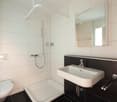 • Modern bathroom with shower, white fixtures, floor and wall tiles, glass door, mirror, vanity with drawers