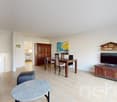 • Open-plan living space with dining table, kitchen area, sofa, TV, chairs, artwork, and decorative items