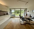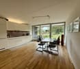 • modern design with wooden floors, large windows with view, modern kitchen set, dining table with chairs