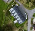 • Large house with brown roof, solar panels, swimming pool, deck, chairs, umbrellas, green grass, parking area, trees