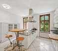 • Large kitchen with wooden table and chairs, tiled floor, wooden cabinets, and large windows overlooking the outdoors