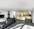 • modern kitchen with stainless steel oven and dishwasher, large black worktop, white kitchen units, grey tiled floor