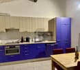 • Spacious kitchen with white cabinets, black granite countertops, wooden cutting board, appliances including a dishwasher and washing machine, shelves with labeled storage containers, and a clock on the wall
