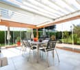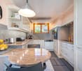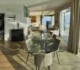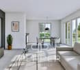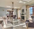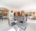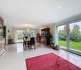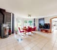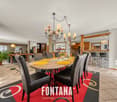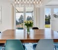 • dining room with large windows, wooden table and chairs, vase of flowers, white kitchen, couches, fireplace
