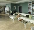 • modern living room, fireplace, large windows, wooden floor, L-shaped white sofa, center table, carpet, plant, ottoman, wall decorations, light fixtures