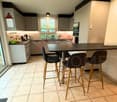 • Spacious kitchen with large windows overlooking a scenic outdoor view, modern kitchen island with gray cabinets, stainless steel appliances, and pendant lighting