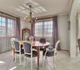 • Dining room with table, chairs, TV, wooden floor, sliding glass doors, kitchen area with wooden cabinets, potted plants, picture frame, dining room table with flowers, and large window with curtains.
