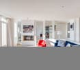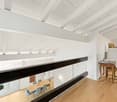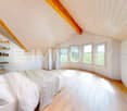 • Spacious attic with exposed wooden beams, large windows, and a fireplace. The room has a minimalist design with a lounge chair, coffee table, and a person sitting on the floor.