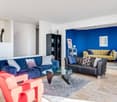 • Large open-concept living space with white walls, hardwood floors, and a stone fireplace. The room features floor-to-ceiling glass doors leading to an adjacent area. The space appears to be newly renovated and has a modern, minimalist design.