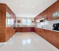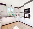 • modern kitchen, large windows, dishwasher, washing machine, built-in appliances, black countertops, wooden floor
