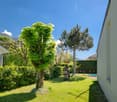 • Garden with well-maintained lawn, a large tree, plants, shrubs, a small flower bed, a paved path, and a white building in the background.