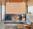 • minimalist kitchen design, fireplace, large window, wooden floors