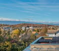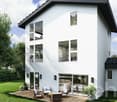 • Villa, two-story house with terrace, surrounded by garden, solar panels on roof