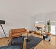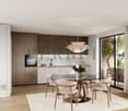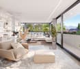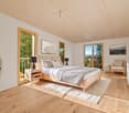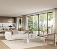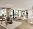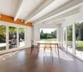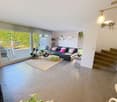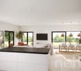 • Spacious open-plan living room and kitchen with large windows, hardwood floors, modern furniture, and a white globe pendant light. The room has access to a balcony or terrace with views of the surrounding nature.