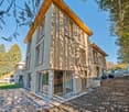 • Modern wooden house with large windows, elevated above the ground, surrounded by lush greenery and a wooden deck or balcony.