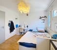 • Spacious bedroom with hardwood flooring, large windows, a bed, a desk with a laptop, and shelves displaying decorative items. The room has a cozy and well-lit atmosphere.