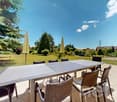 • white house, garage, balcony, large green lawn, outdoor dining area, Tesla car
