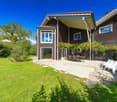 • Modern wooden structure with large windows, covered patio or balcony, surrounded by lush greenery