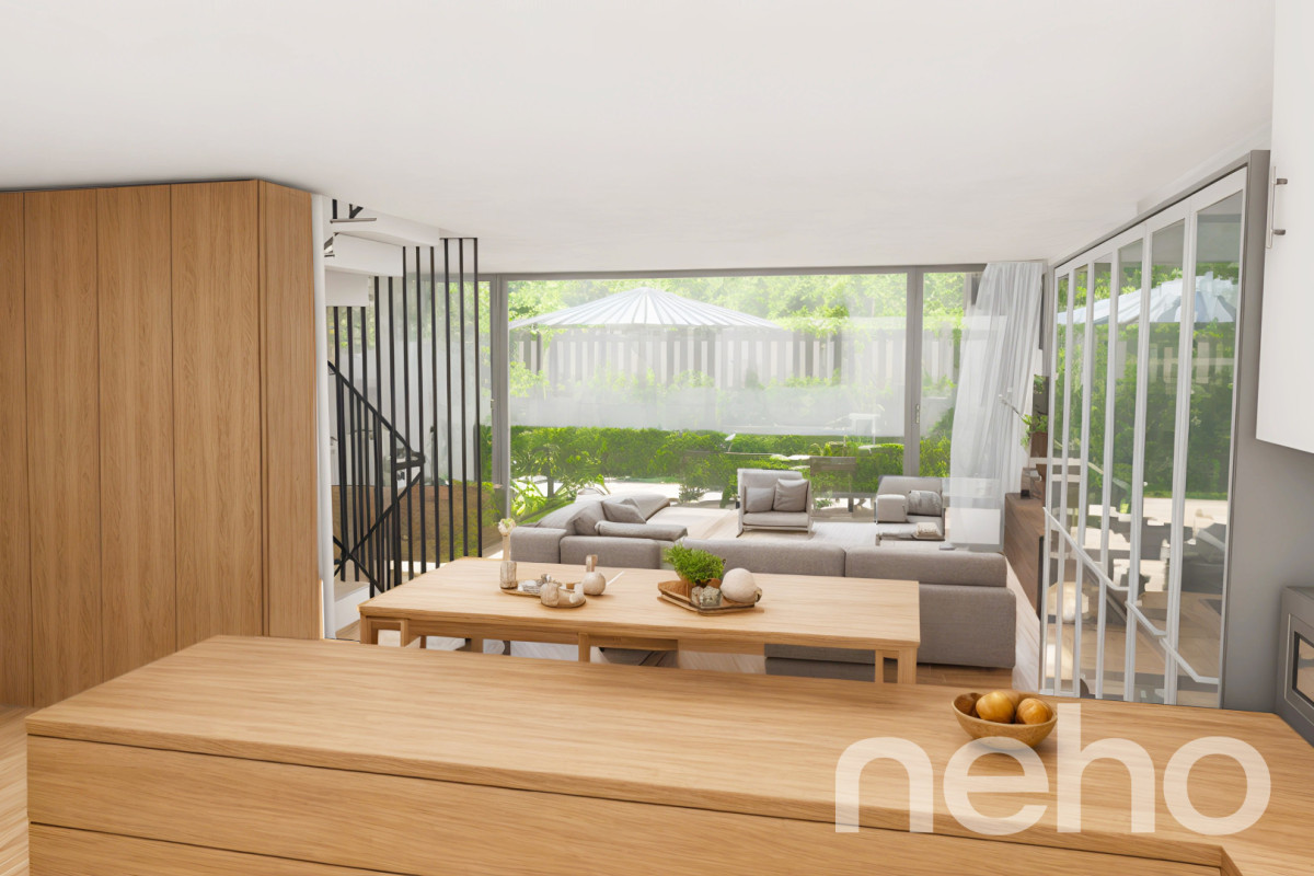 • Modern two-story wooden house with large windows, open kitchen, and outdoor patio area with wooden deck and landscaping