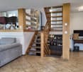 • Spacious open-plan living room and kitchen with large windows, hardwood floors, modern furniture, and a white globe pendant light. The room has access to a balcony or terrace with views of the surrounding nature.