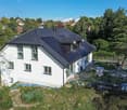 • Villa, two-story house with terrace, surrounded by garden, solar panels on roof