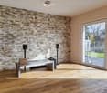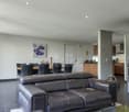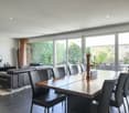 • Spacious open-plan living room and kitchen with large windows, hardwood floors, modern furniture, and a white globe pendant light. The room has access to a balcony or terrace with views of the surrounding nature.