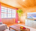 • wooden floor, large glass door, outdoor dining area, white curtains, small potted plant