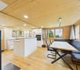 • white cabinetry, wooden countertops, integrated appliances, sliding doors, dining table, chairs, wooden floor