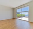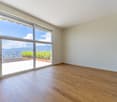 • A spacious room with wooden flooring and white walls. It has large glass sliding doors that lead to a balcony with a view of a mountain. The room features large windows, a radiator, and a power outlet on the wall. Outside the balcony, there is a fence and