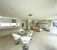 • Leather sofas, white tile flooring, large dining table, glass vase, dining table bench, large mirror