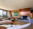 • Villa on hillside, red roof, green lawn, large windows, bushes, surrounded by trees